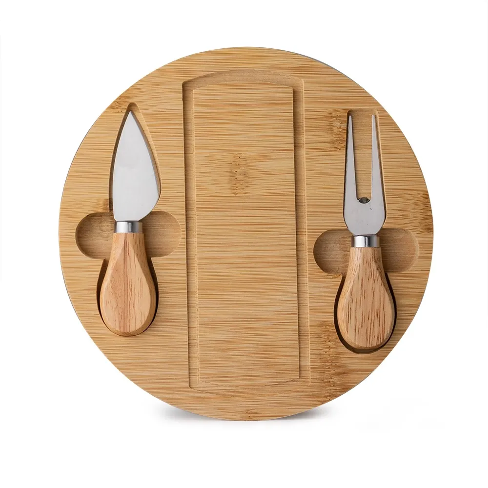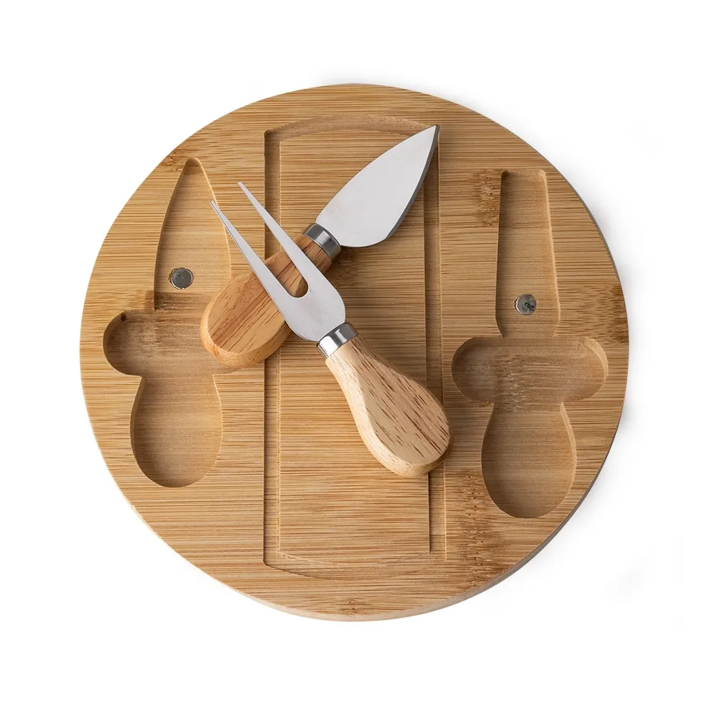 Kit queijo 3 peças, contém: tábua de bambu com canaleta, faca com ponta, garfo e espátula. Tábua com imã para encaixe e fixação dos utensílios.